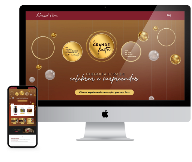 O layout do hotsite foi criado sob medida pelo time da SW, a partir do KV da ação “A Grande Festa”. Com a aprovação da arte pelo time Grand Cru, seguimos com o desenvolvimento do front-end e back-end, suporte técnico e fornecimento de infraestrutura (host) para o grande volume de acessos.
