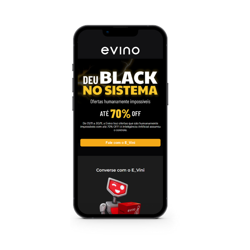 Para elevar a experiência do cliente a campanha trazia o E_Vini, um personagem futurista que tomou conta do e-commerce e do app da Evino durante toda a ação.
