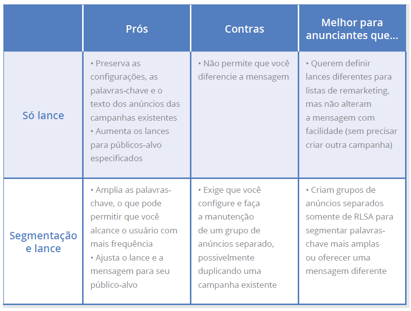 Segmentação e lance permite configurar um grupo de anúncios separado que segmenta apenas os membros da sua lista de remarketing. Assim, você cria lances e mensagens específicos para a lista.