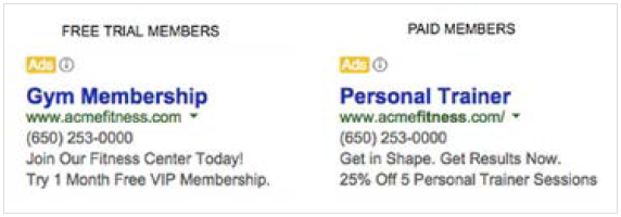 A Acme Fitness oferece dois tipos de matrícula à academia: experimental gratuita e paga. Eles desejam ter anúncios e páginas de destino separados para os usuários experimentais e para os membros pagantes. Copiar uma campanha de RLSA para os membros experimentais permite que eles mantenham os grupos separados e falem diretamente com cada um.